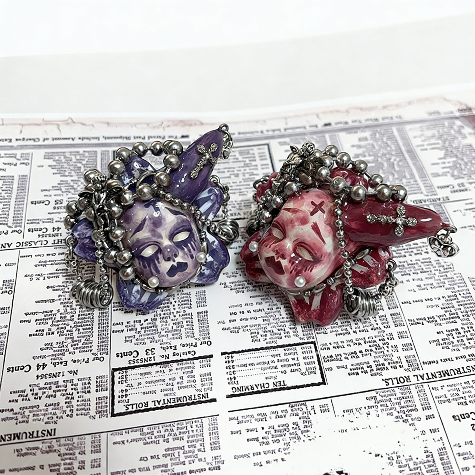A stone clay doll head with a pink-white gradient makeup, flanked by butterfly wings and encircled by glass beads, topped with skull and bunny ear decorations, and hanging metal heart pendants below, creating a perfect balance of sweetness and edginess.